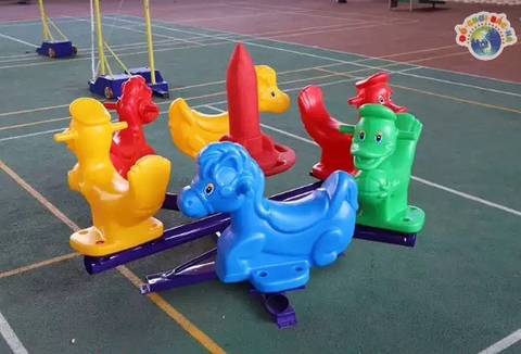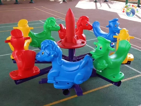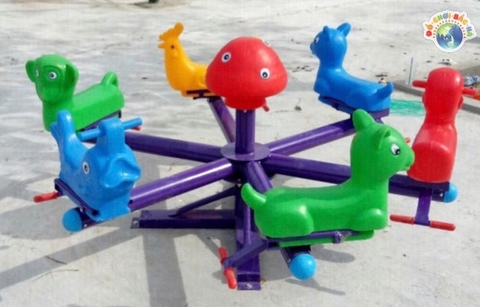 Chất liệu: Khung thép sơn tĩnh điện, mặt sàn bằng tôn dập. Con giống bằng nhựa Hdpe đúc nguyên khối. Chuyển động quay tự hàng bằng hệ thống trục bi chuyên dụng. Đảm bảo an toàn, chắc chắn cho trẻ khi chơi.